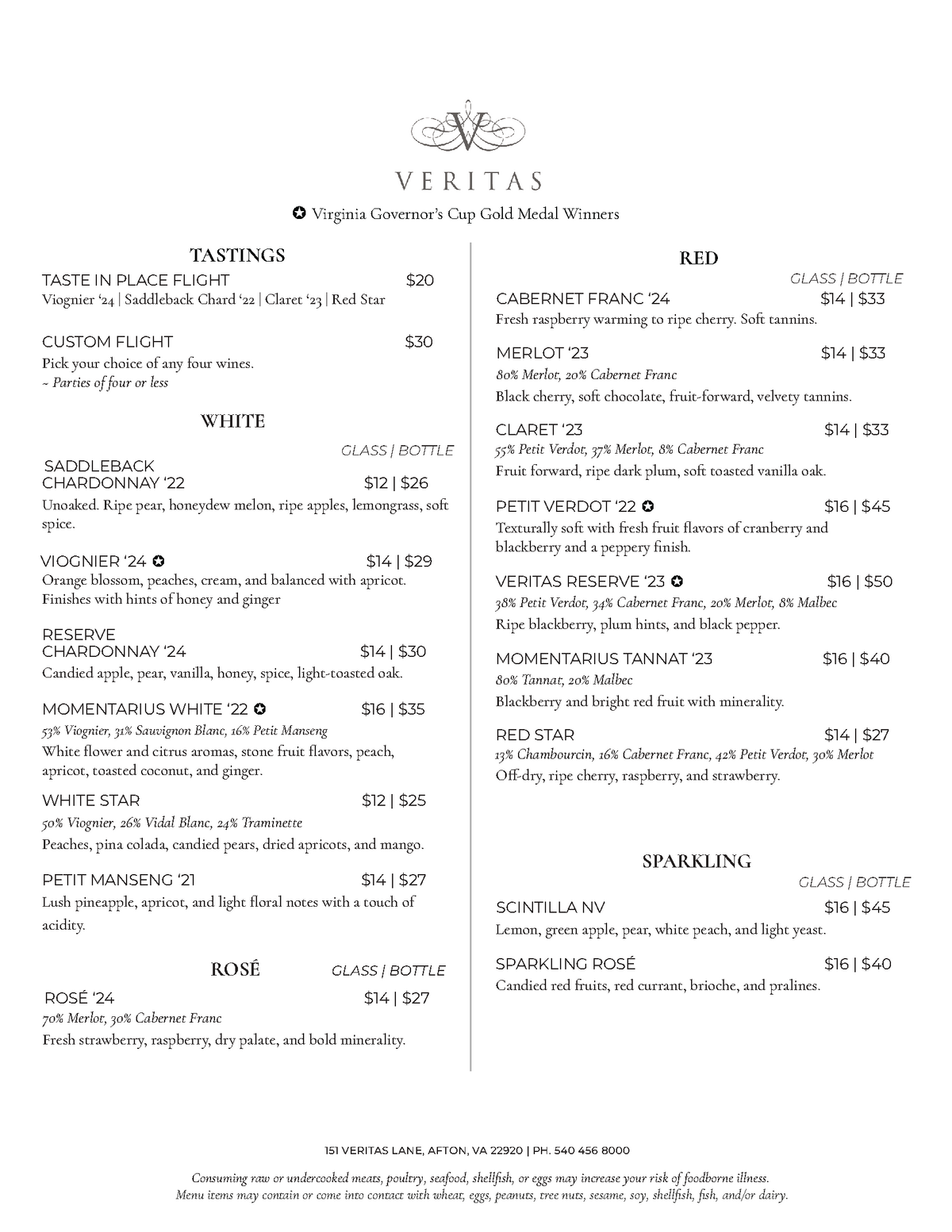 Tasting room menu